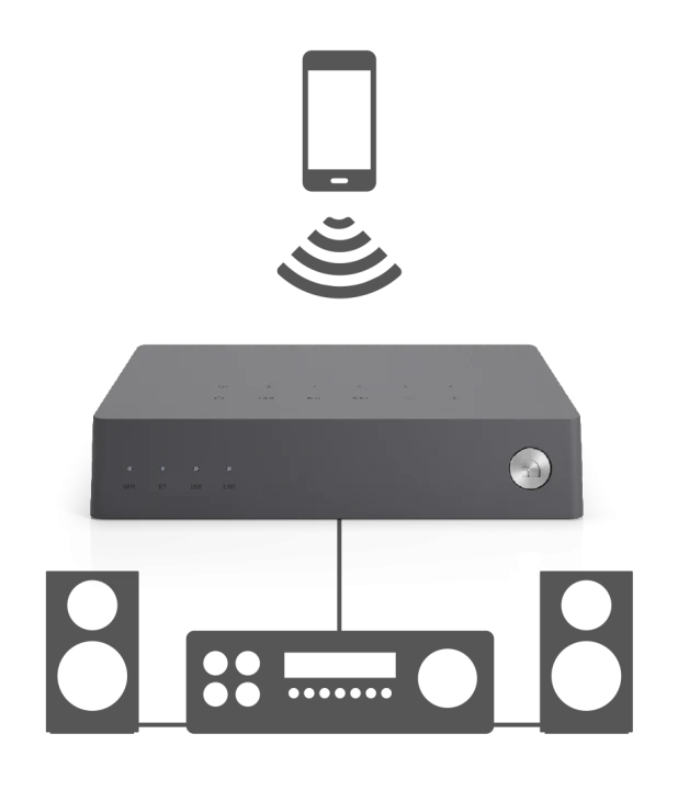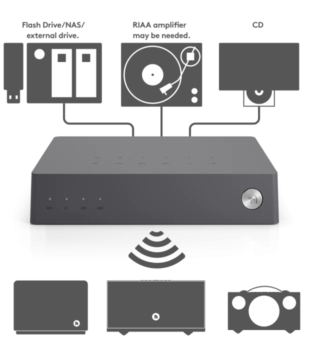 - Retransmita cualquier equipo de audio a través de la entrada de línea y reprodúzcalo en su configuración multisala.