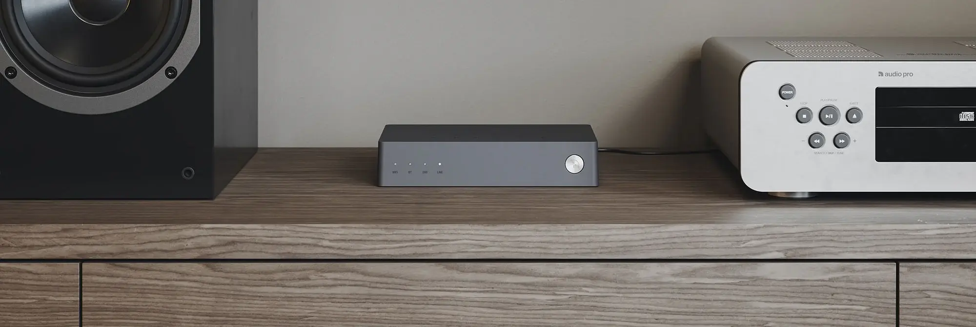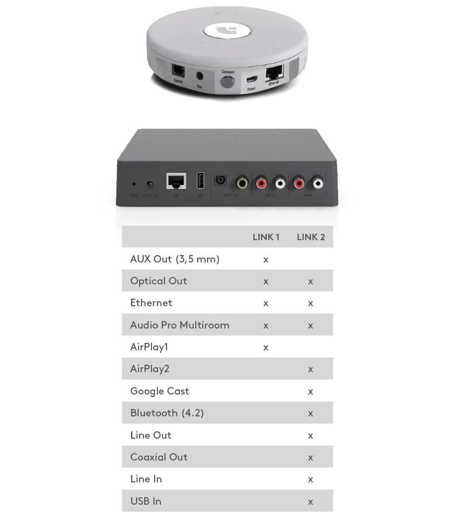 La unidad Link 2 es un pequeño e inteligente reproductor de música y multisala. Puedes elegir entre tres sistemas wifi diferentes: AirPlay 2, Google Cast o Audio Pro multisala. También puedes conectarlo a cualquier equipo de audio (reproductor de vinilo*, reproductor de CD, etc.) y retransmitir el sonido a nuestros dispositivos multisala por wifi. *Puede que necesites un amplificador RIIA.