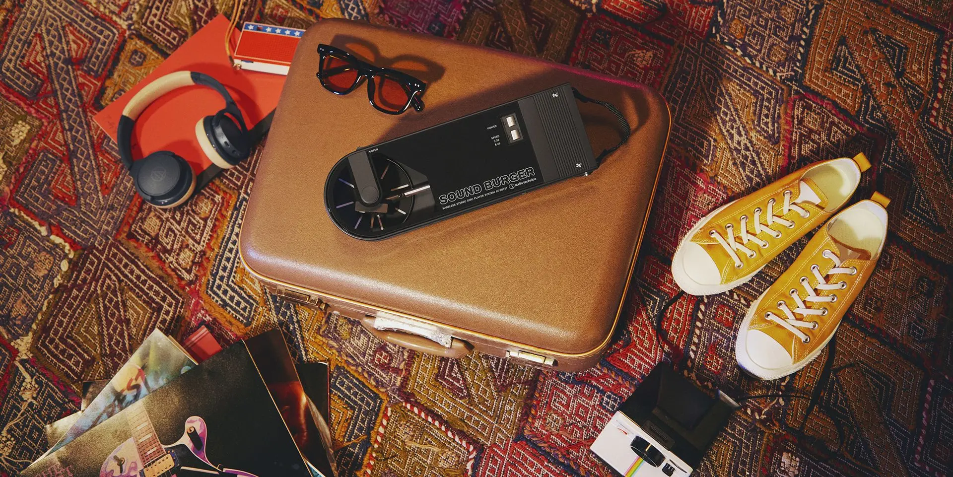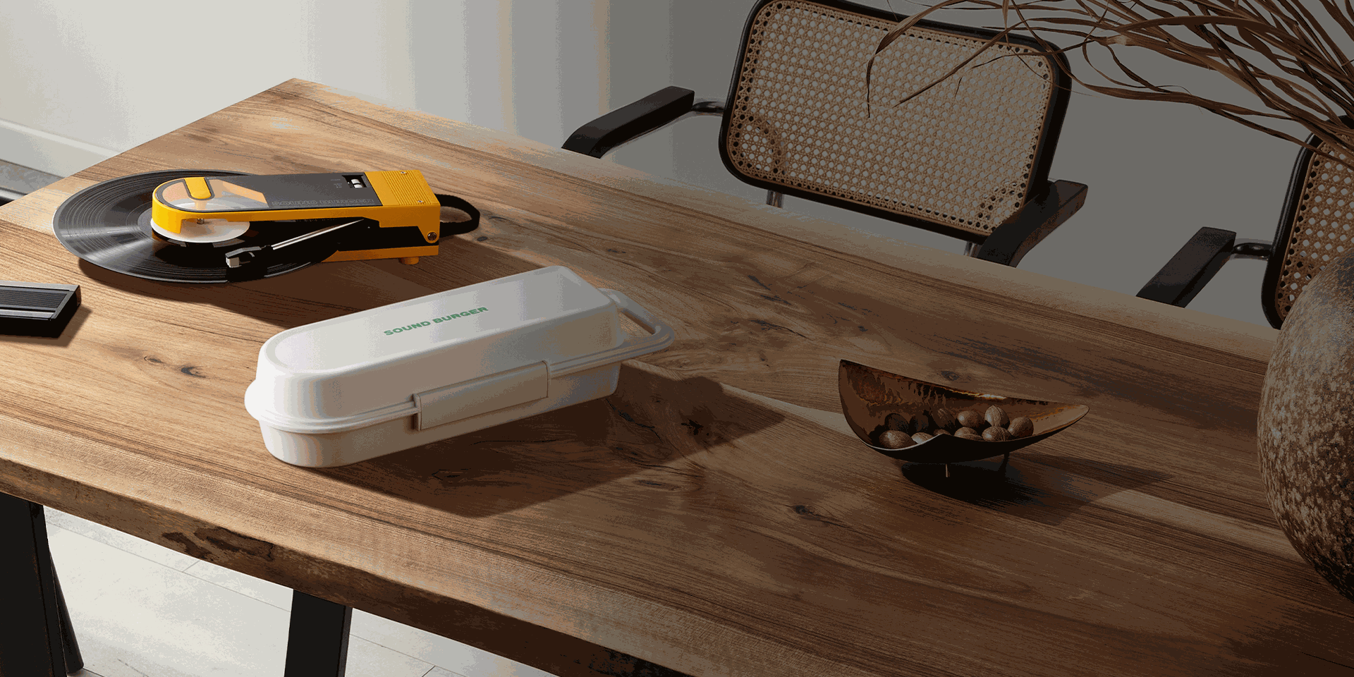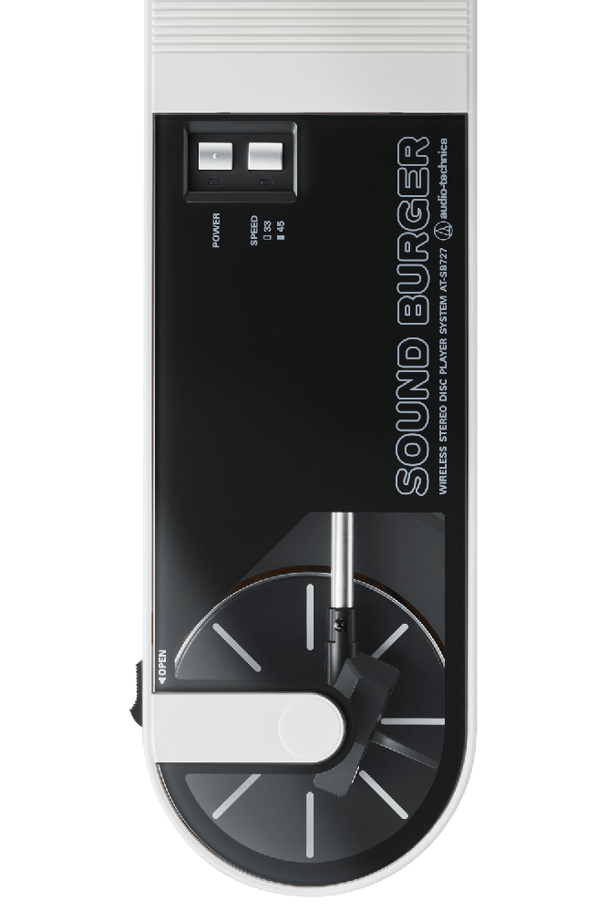 El Sound Burger ofrece una reproducción de sonido de alta calidad con un sistema de tracción por correa para reproducir discos de 33-1/3 y 45 rpm. Para lograr tanto la portabilidad como la estabilidad, el brazo emplea un sistema de equilibrio dinámico en el que la presión de la aguja se aplica mediante un resorte. Además, un motor de corriente continua de alta precisión mantiene una rotación estable. Este exclusivo giradiscos dispone de un plato de aleación de aluminio fundido a presión con sistema de amortiguación y una aguja ATN3600LC reemplazable (se vende por separado). El Sound Burger también incluye un cable de audio para quienes prefieran una experiencia de escucha analógica con cable.