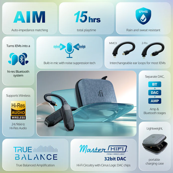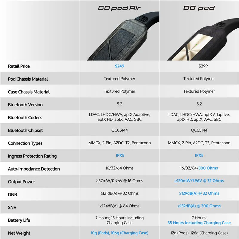 Los auriculares Bluetooth TWS (True Wireless Stereo) se han convertido en un accesorio esencial para el estilo de vida, pero muchos audiófilos ahora se enfrentan a pagar un precio más alto por una experiencia auditiva inferior a la de sus IEM con cable. En nuestro constante afán por superar las barreras para los amantes de la música más exigentes, los GO pod Air son nuestra solución más ligera, portátil y asequible para el dilema de los TWS. Simplemente conecta tus IEM favoritos a una de las muchas opciones de diadema y transfórmalos con compatibilidad Bluetooth de alta resolución , controles táctiles intuitivos y llamadas sin ruido.