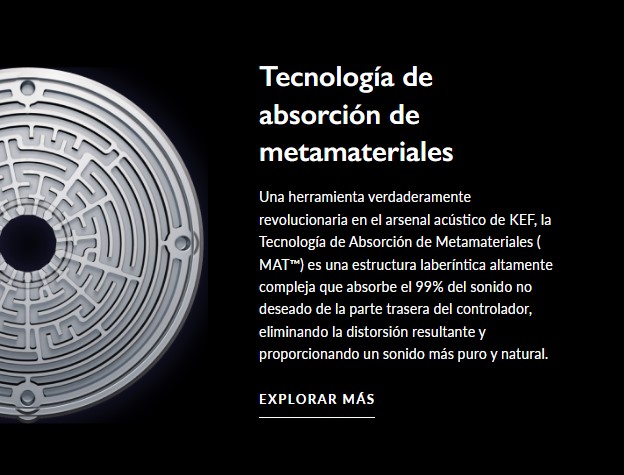 Una herramienta verdaderamente revolucionaria en el arsenal acústico de KEF, la tecnología de absorción de metamateriales (MAT) es una estructura en forma de laberinto altamente compleja que absorbe el 99% del sonido no deseado de la parte trasera del transductor, eliminando la distorsión resultante y proporcionando un sonido más puro y natural.