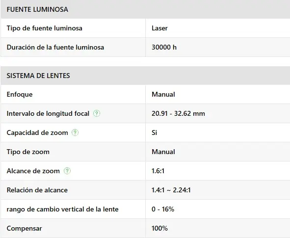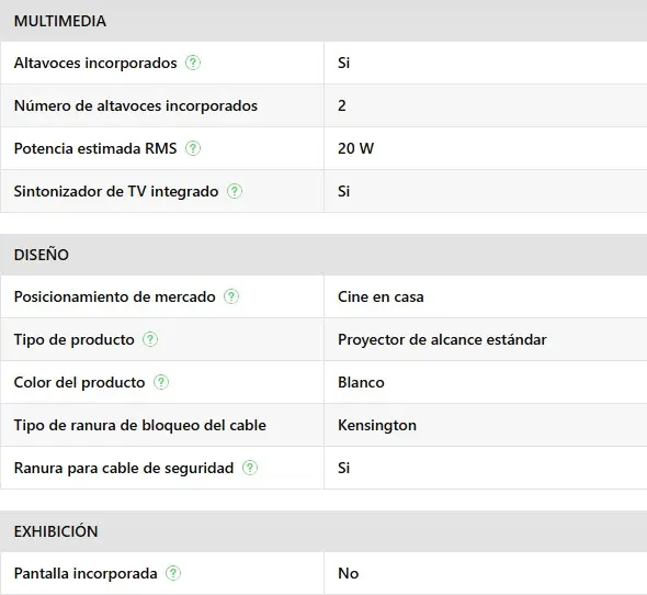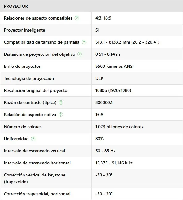 >Proyector inteligente Compatibilidad de tamaño de pantalla: 513,1 - 8138,2 mm (20.2 - 320.4") Número de colores: 1,073 billones de colores