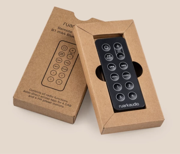 Nuestro control remoto compacto es un práctico complemento para tu R1 y te permite un control inalámbrico total. Guarda y selecciona tus emisoras de radio favoritas con cuatro botones de presintonía, selecciona la fuente de entrada, controla el volumen, pausa, retrocede o salta pistas y apaga el equipo.