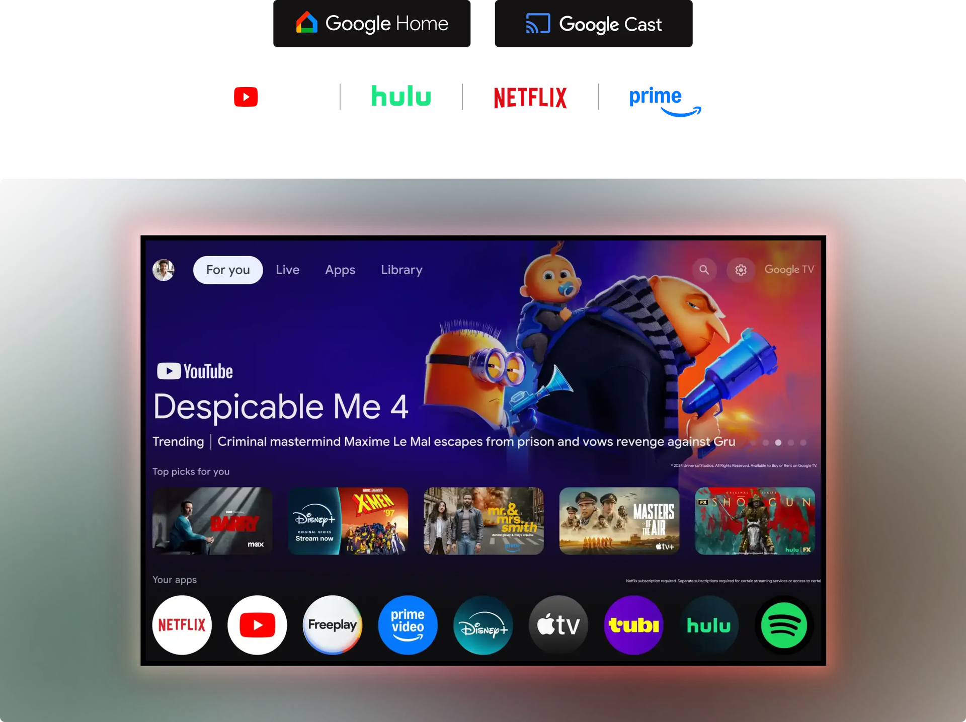 Google TV integrado pone Netflix, YouTube, Prime Video y mucho más al alcance de su mano, sin necesidad de dispositivos adicionales. El control por voz es sencillo con la integración de Google Home, lo que le permite una experiencia manos libres.
