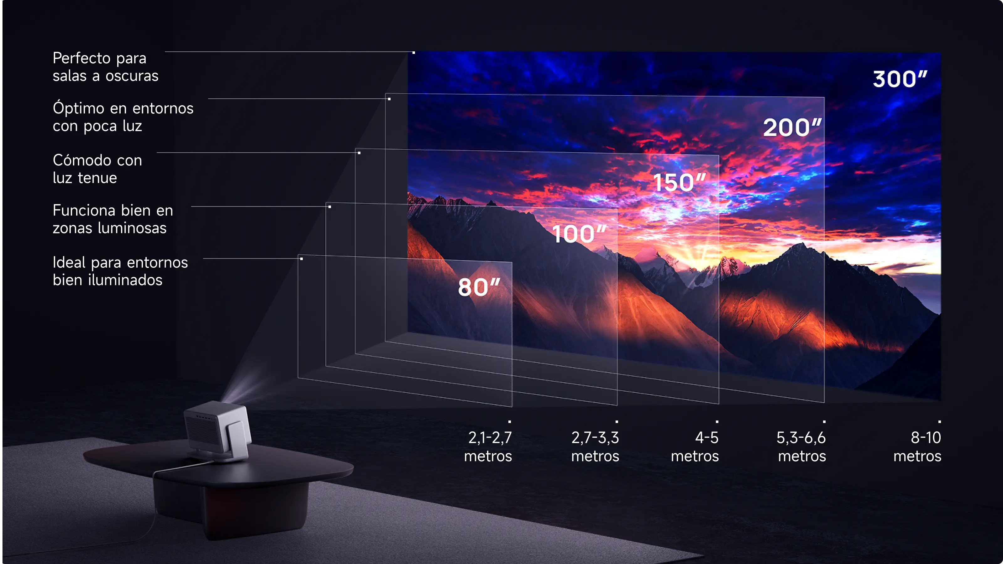 8. Para la mejor experiencia de visualización, recomendamos usar un tamaño de proyección de 60-150 pulgadas. Exceder este rango puede afectar la calidad de su contenido proyectado. La calidad de la pantalla puede variar según los hábitos de uso del producto y las condiciones ambientales.