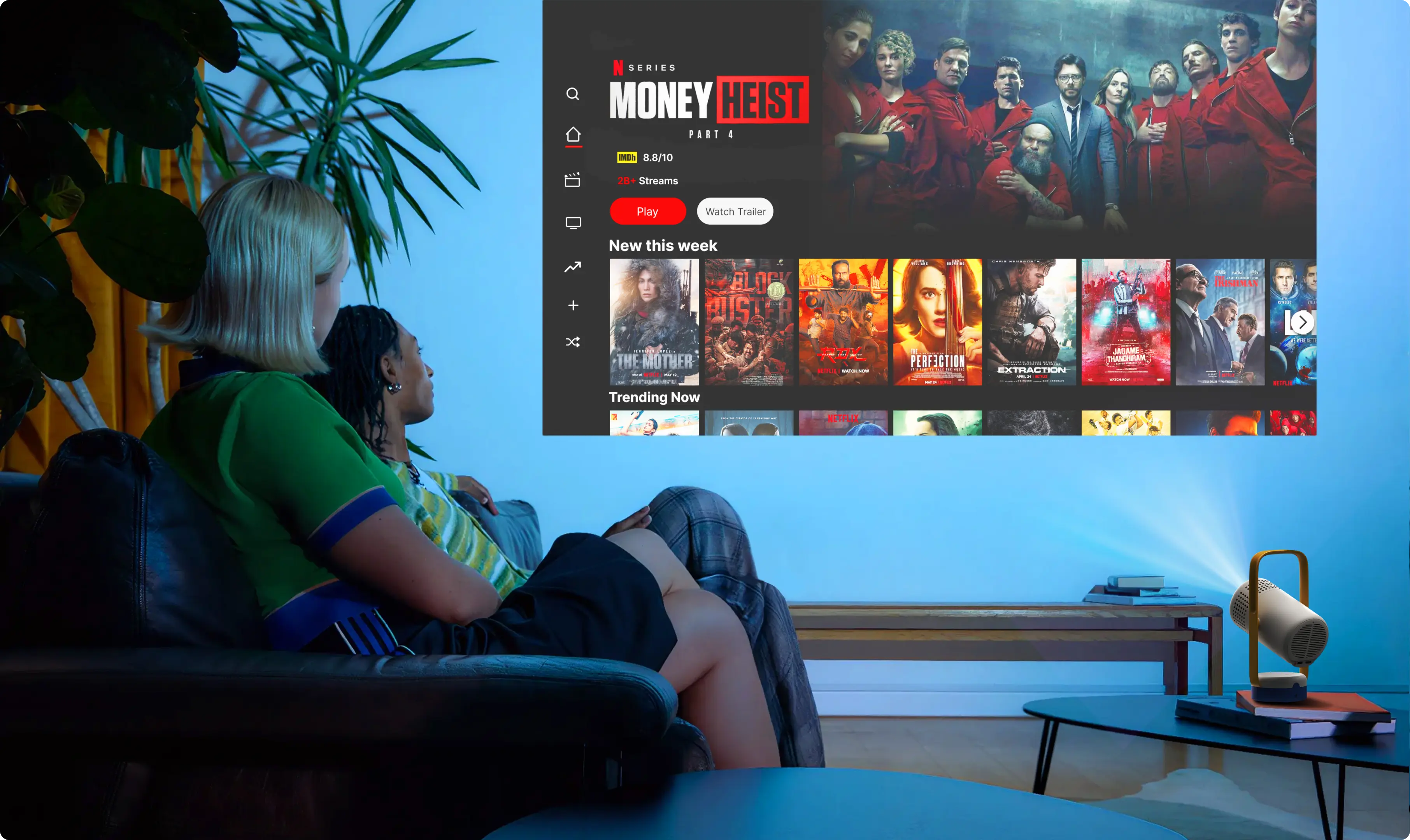 Google TV con Netflix oficial: disfruta de los últimos estrenos de Hollywood y de las series imprescindibles en una asombrosa calidad de 1080p directamente desde tu Vibe One (con batería). Con acceso instantáneo a más de 400 000 películas y capítulos en un solo lugar, tendrás infinitas opciones de entretenimiento siempre al alcance de la mano.